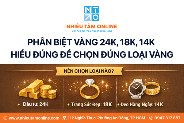 Khi mua trang sức hoặc đầu tư vàng, nhiều người thường thấy các ký hiệu 24K, 18K, 14K nhưng không hiểu rõ sự khác biệt. Thực tế, các con số này thể hiện hàm lượng vàng nguyên chất trong hợp kim vàng. Việc hiểu rõ sẽ giúp bạn chọn đúng loại vàng phù hợp với mục đích sử dụng như đầu tư, làm trang sức hay kinh doanh kim hoàn.