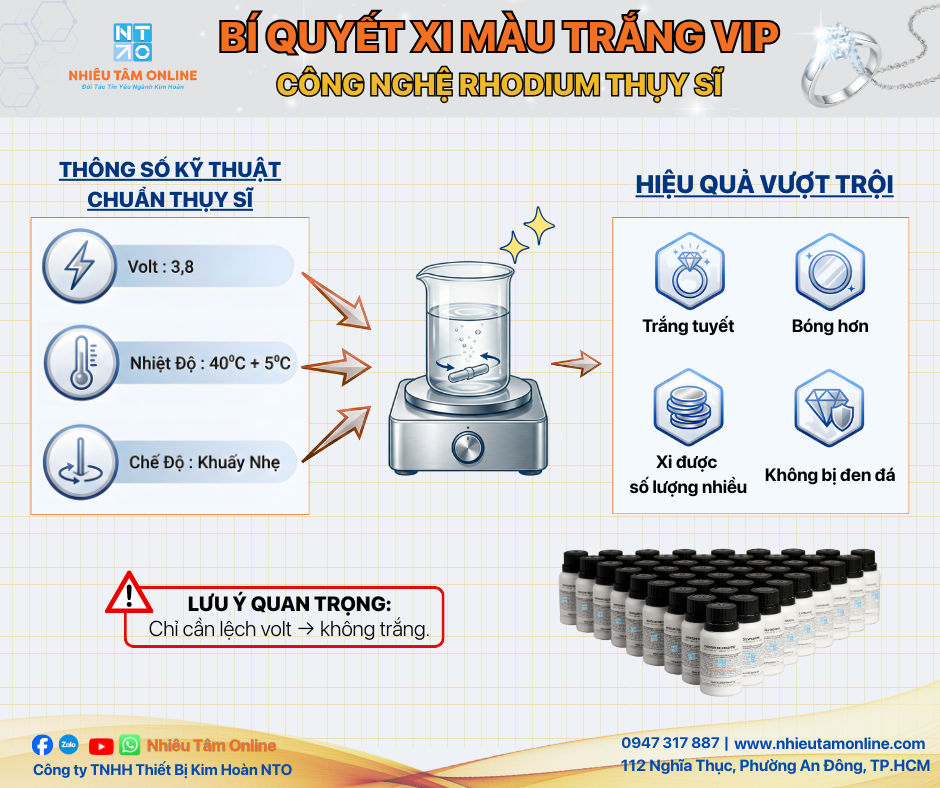 Với hơn 15 kinh nghiệm trong ngành kim hoàn, Nhiêu Tâm Online tự hào là đơn vị cung cấp giải pháp xi mạ toàn diện, giúp các xưởng xử lý triệt để tình trạng hàng lỗi, nâng cao độ bóng sâu và độ bền màu cho trang sức. Nhiêu Tâm Online chuyên phân phối hóa chất xi mạ nữ trang, hội chế tác kim hoàn, thiết bị máy móc kim hoàn, dụng cụ thợ bạc cao cấp tại Việt Nam mang lại trải nghiệm vượt trội.