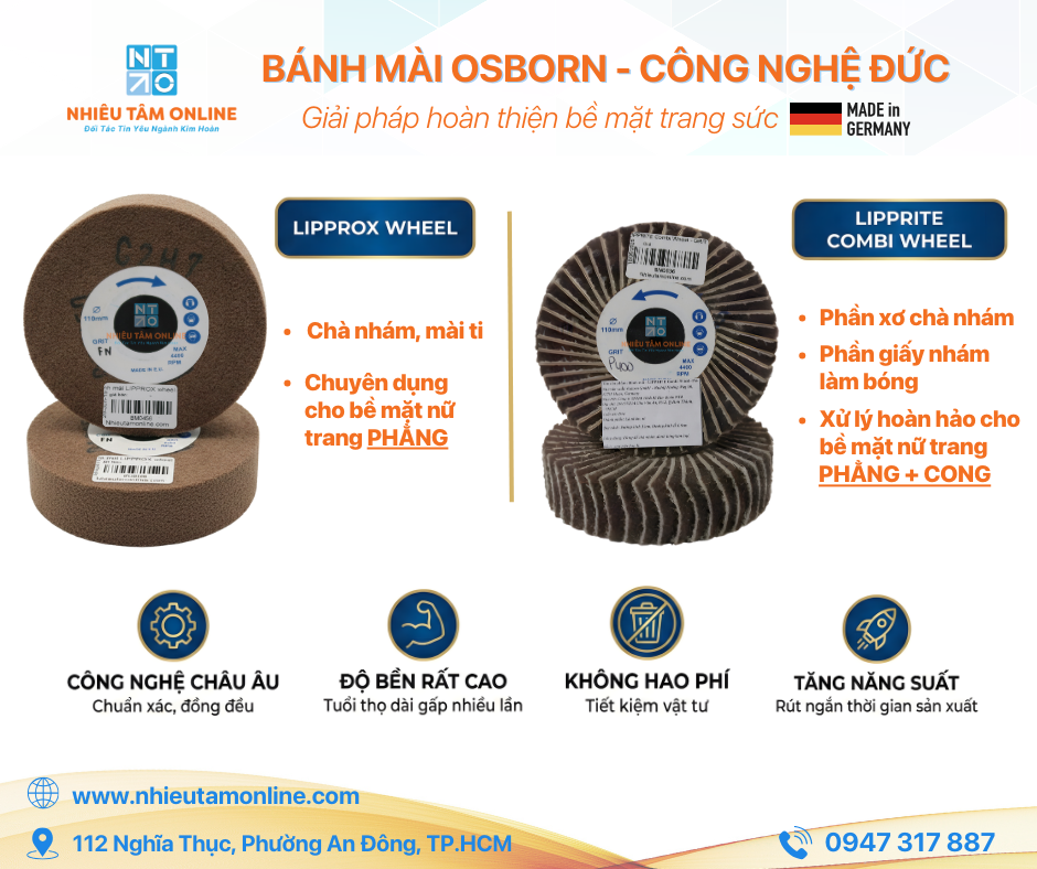 - Bánh Lipprox wheel được cấu tạo đặc biệt, giúp việc mài ti sản phẩm sau khi đúc dễ dàng, nhanh chóng, tiết kiệm rất nhiều thời gian và chi phí nhân công so với cách dùng giấy nhám thông thường.